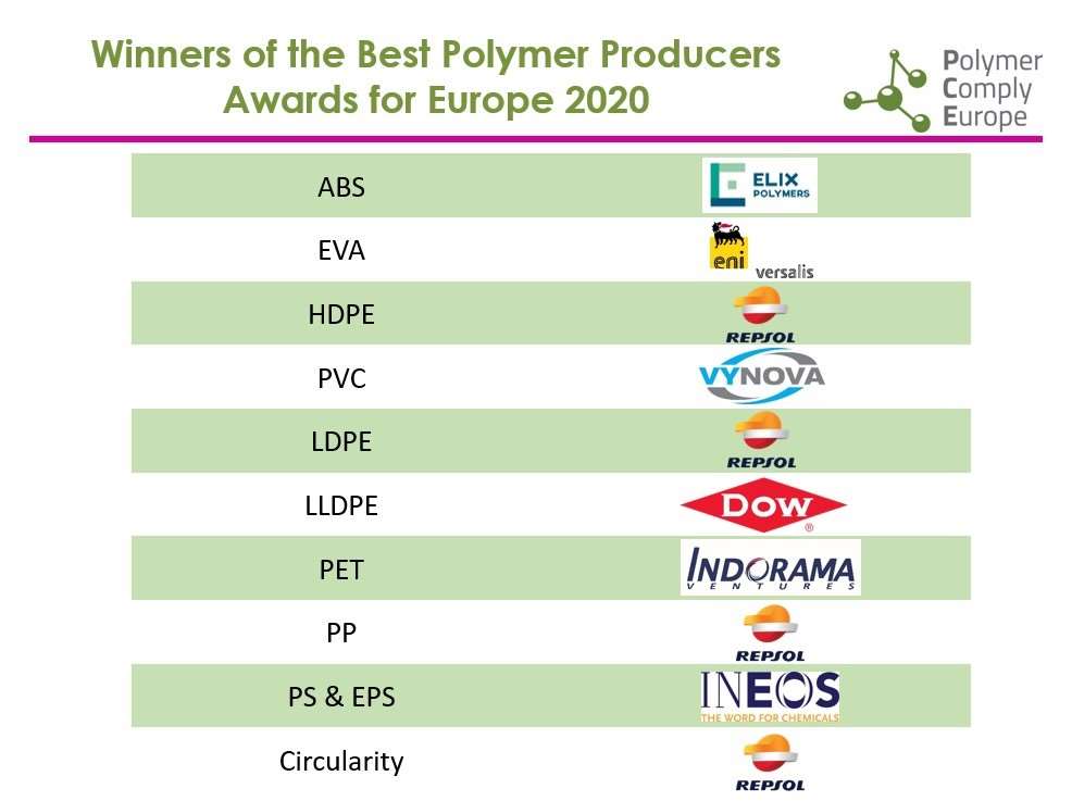欧洲聚合物联盟(Polymers for Europe Alliance )是由欧洲塑料加工协会(EuPC)发起的在线信息分享平台,由该联盟主办的“最佳聚合物生产商”评选活动基于欧洲各地聚合物用户共同参与的一项在线调查,以2019年6月到2020年5月为区间,评估聚合物供应商的表现,评估内容包括聚合物质量、循环性、交付可靠性、沟通和创新五大方面。