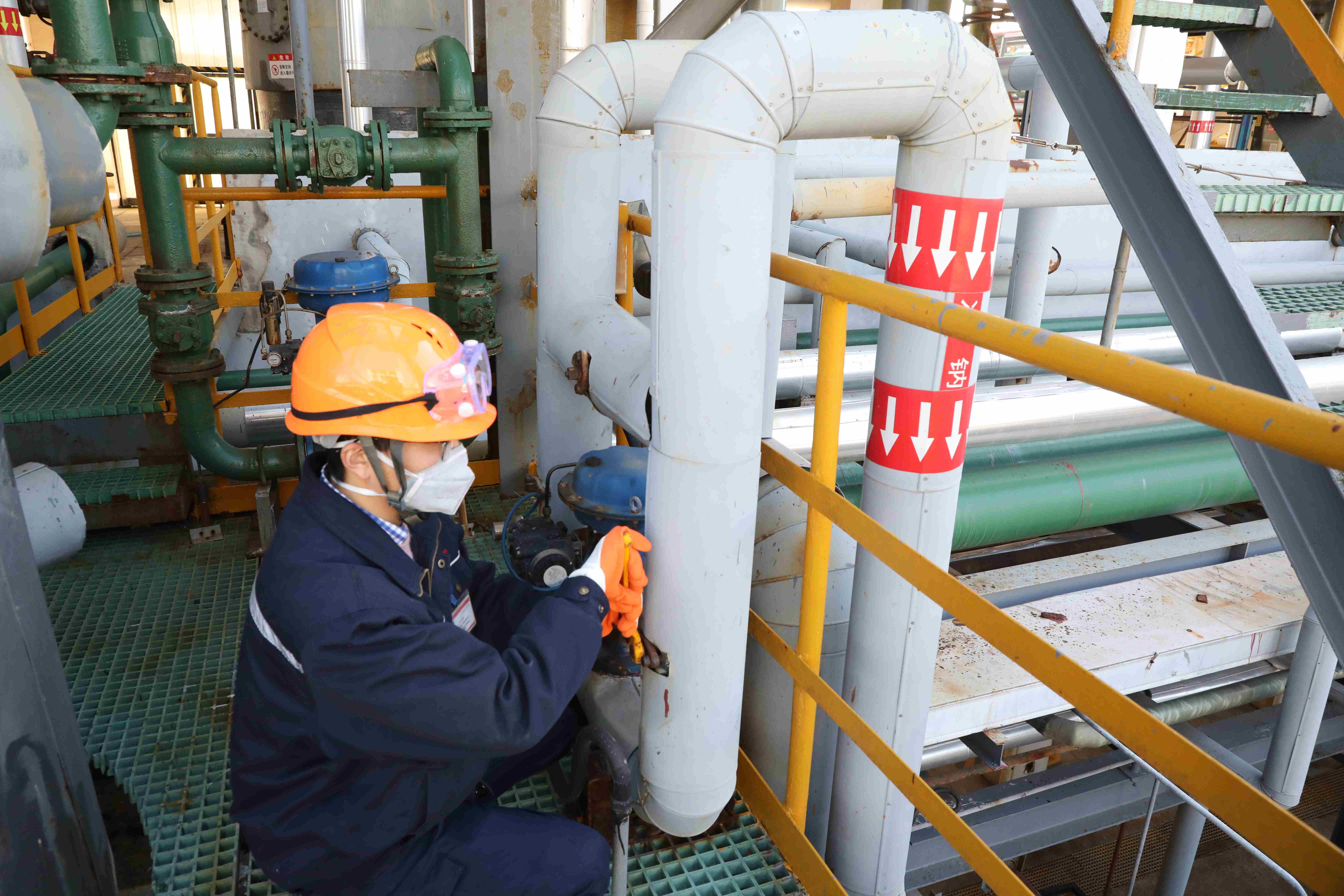 电离工段段长吴沛有着丰富的生产管理经验。1月26日年初二一大早,吴沛就赶到了工段,带领常日班员工加入到生产保障组中。他们一方面加强对现场设备的隐患排查与整改消缺,另一方面通过对换热器的在线清洗等手段,延长使用周期。为确保装置的安全可靠运行,生产保障组全体组员轮流值班,随时处理可能出现的问题。