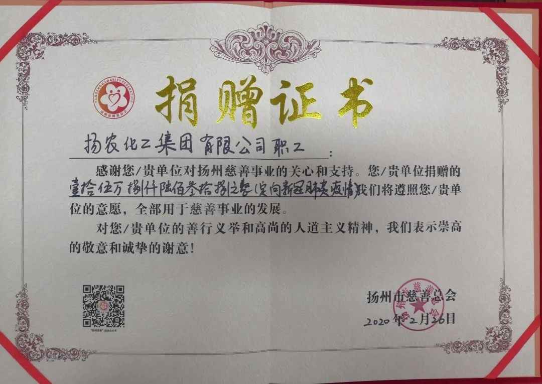 其中,扬农集团总部向扬州市慈善总会捐款158638元、扬州市广陵区慈善总会捐款150000元,用于抗击新冠肺炎;瑞祥公司、扬农锦湖、中化高纤分别向仪征红十字会捐款153097元、44011.11元和43900元;瑞泰公司向宁夏中卫市园区管委会捐款136577元;中化锂电筹得48956元;瑞恒公司向连云港市慈善总会捐赠100000元,定向用于徐圩新区一线工作人员防疫。