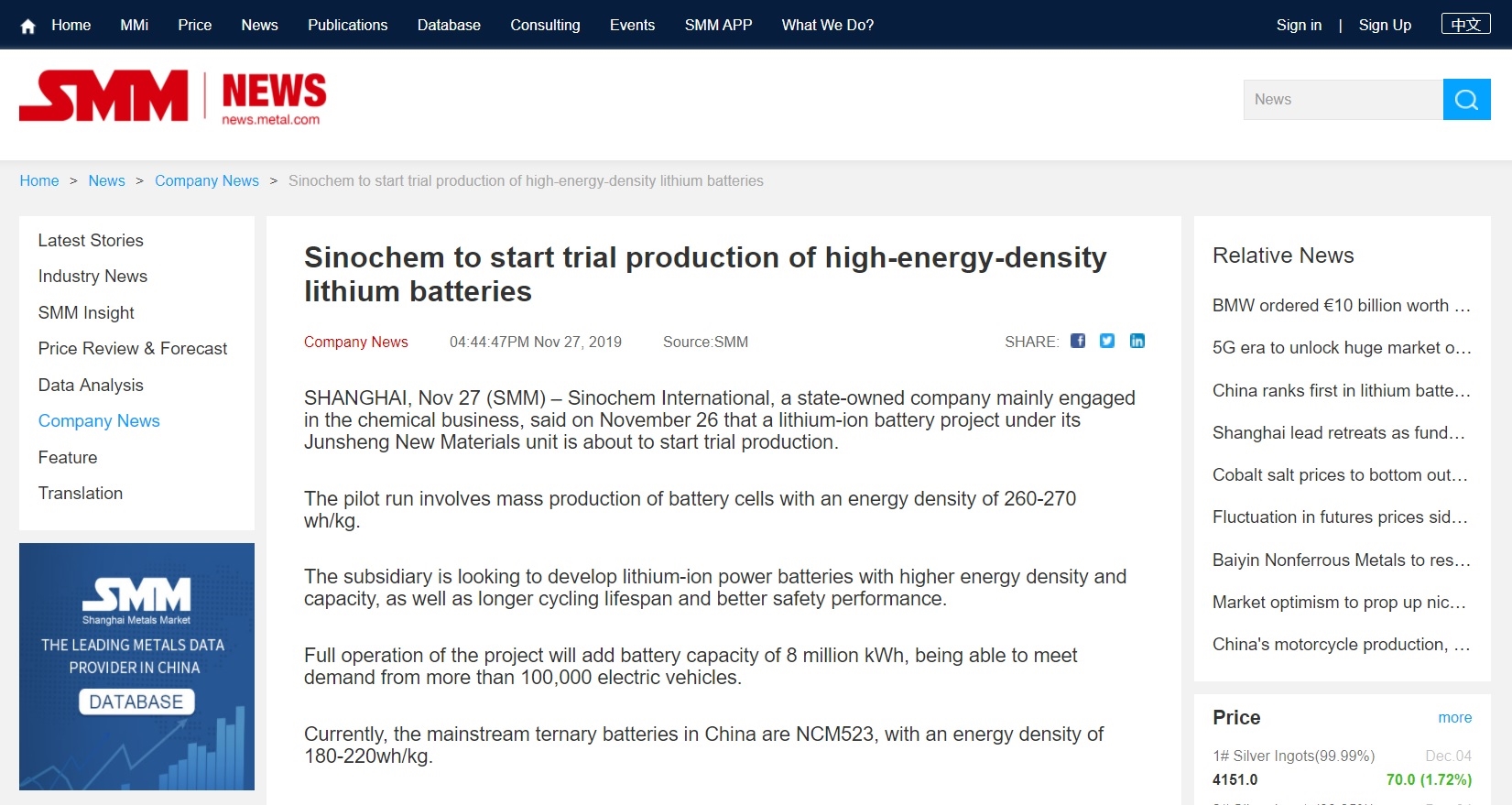 Source: https://news.metal.com/newscontent/100998453/sinochem-to-start-trial-production-of-high-energy-density-lithium-batteries/