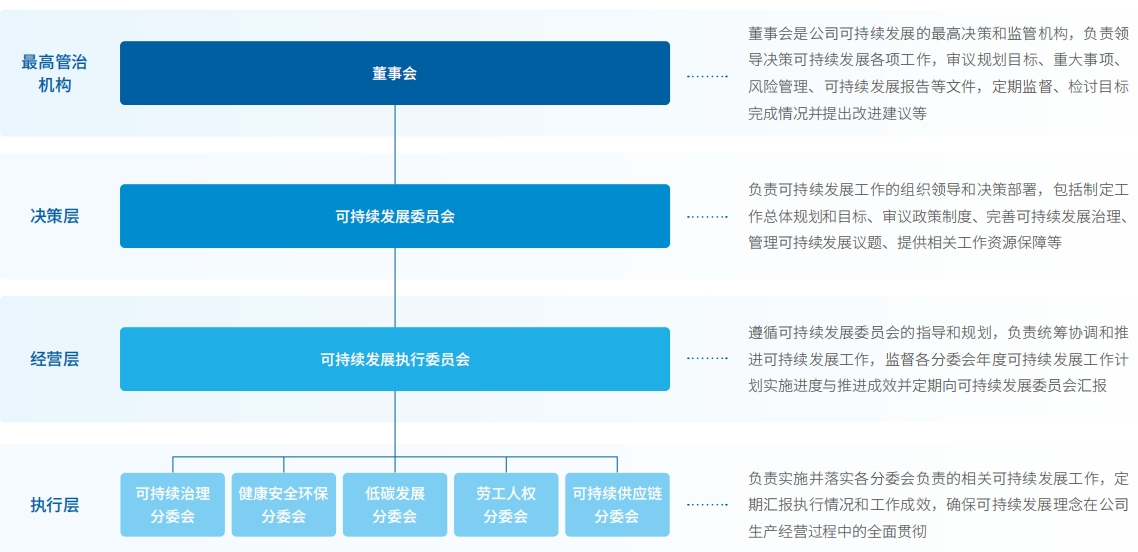 公司在经营层层面设立可持续发展执行委员会及可持续治理、健康安全环保、低碳发展、劳工人权、可持续供应链五个专业分委会,承担各自领域可持续发展工作。
