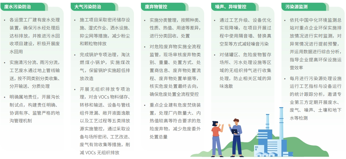 中化国际严格遵守国家关于废气、废水、废弃物、土壤和地下水等污染物排放的标准和要求,积极开展“无废集团”试点建设,依法合规处置各类污染物,从源头上推行绿色清洁生产工艺以减少污染物产生,优化三废治理设施运行,对重点企业排放情况进行实时监测,确保公司运营工厂污染物远低于标准限值排放,杜绝环境污染事件发生。
