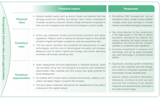 Based on its own business development, Sinochem International actively identifies and evaluates climate risks and opportunities, regularly reviewing, updating, and formulating forward-looking countermeasures to mitigate the impact of climate change on the company's business. It strives to strengthen the supervision of the implementation of "dual carbon" work, strengthen the main responsibilities at all levels, and do a good job in the supervision of new energy conservation and emission reduction projects and renovation projects at all bases, as well as in the construction of carbon emissions and carbon verification business capabilities.