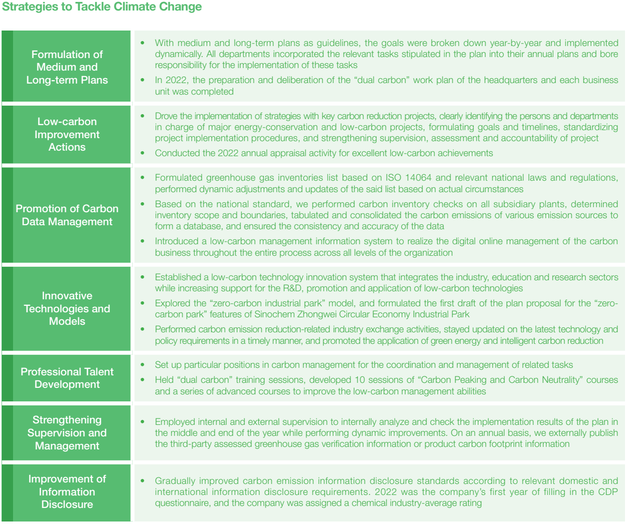 Handling climate change and low-carbon transition have become common challenges for mankind. Sinochem International has actively responded to the 1.5°C goal of the Paris Agreement and China’s “Carbon Peaking and Carbon Neutrality” goal. Based on the framework of recommendations put forth by the Task Force on Climate-related Financial Disclosures (TCFD), the company incorporated climate change risks into its risk management system, formulated the Carbon Peaking and Carbon Neutrality Action Plan, optimized carbon management working mechanisms and action paths, and comprehensively implemented low-carbon transition.